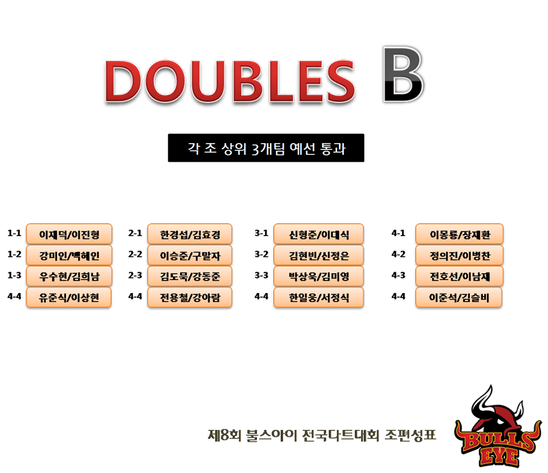 안내 | 제8회 전국다트대회 조편성표 페이지 정보 작성자 불스아이 작성일2018-10-19 이전글 다음글 본문 일요일 오전 9시부터 엔트리 확인을 하면서 신청서에 사인을 받습니다. 반드시 본인 신분증을 지참하셔야 합니다~ 목록