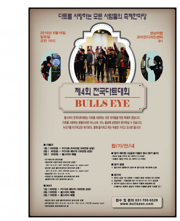 제4회 불스아이 전국다트대회 페이지 정보 작성자 불스아이 작성일17-12-13 20:32 조회11,773회 댓글0건 관련링크 이전글 다음글 목록 본문 일시 : 2016년 6월 19일(일요일) 장소 : 성남 야탑 코리아디자인센타 B1 부문 : 싱글즈 / 더블즈 이전글 다음글 목록